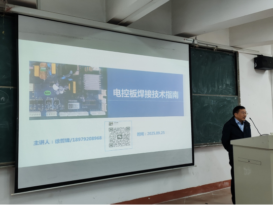 为继续深化单片机课程群教学改革,进一步加强示范性实践教学基地(单片机实践教学基地)建设,电信专业于10月22日上午特邀九江恒通自动控制器有限公司副总经理徐哲锋莅临公司,在竞知楼阶七教室成功举办了题为《电控板焊接技术指南》专题讲座,教研室主任谢新文,专业负责人曹晖,单片机课程组教师吴华杰、谢辉程、高玉宝、漆世锴,以及电A2211、电A2212、电A2213班全体员工参加了讲座。