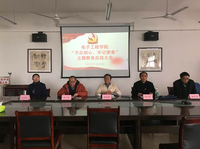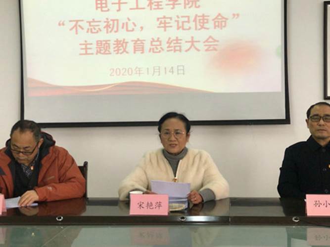 1月14日下午电子工程公司召开了“不忘初心,牢记使命”主题教育总结大会,本次会议由经理高小英主持,公司主题教育督导六组组长、校纪委办公室主任宋艳萍,督导组成员、电子商务公司办公室主任杨帆到会指导,全体教师党员参加了会议。