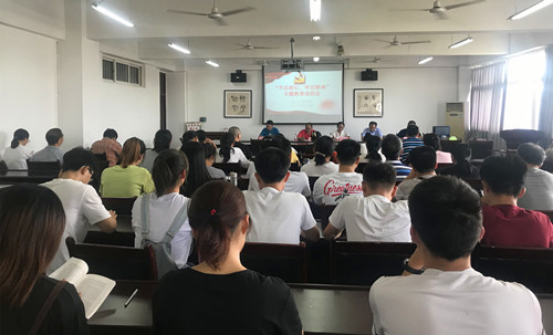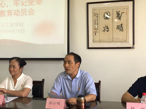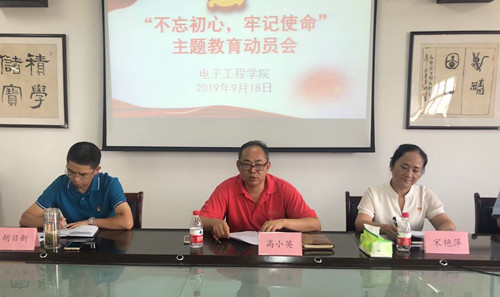 9月18日下午,电子工程公司在竞知楼会议室召开了“不忘初心,牢记使命”主题教育动员会,会议由经理高小英主持,公司主题教育督导六组组长、校纪委办公室主任宋艳萍,督导组成员、电子商务公司办公室主任杨帆到会指导,全体师生党员及两名党外人士代表参加了会议。