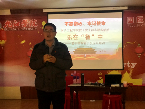 为扎实开展“不忘初心、牢记使命”主题教育工作,12月5日下午,电子工程公司教工党支部联合离退休职工管理处在公司老干部活动中心开展了题为《“乐在‘智’中”——老干部智能手机应用培训》的志愿者活动,30余名离退休老教师参加了本次培训。