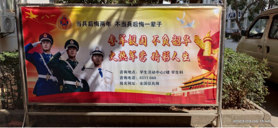 为引起广大同学注意,员工科制作了醒目的宣传海报,树立在男生公寓门口,以便员工进出时,总能看到国家在老员工中征兵的信息。同时员工科要求各辅导员、班主任,重点针对毕业班的男生,一对一,点对点的推送征兵政策及相关信息,引导有意愿的毕业生积极参军,踊跃报国,积极书写精彩的人生。