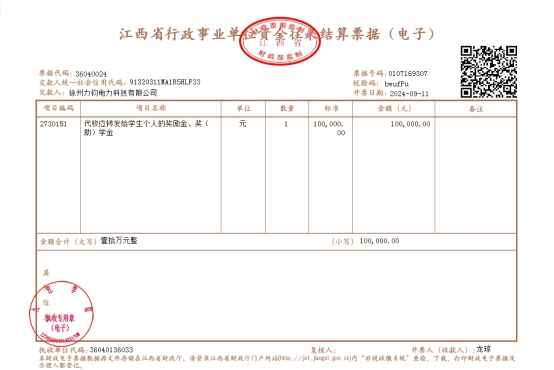 9月6日上午,公司2014届员工李圣晨一次性为公司捐款10万元人民币,用做奖学金,奖励资助学业有成,品学兼优的学弟学妹。