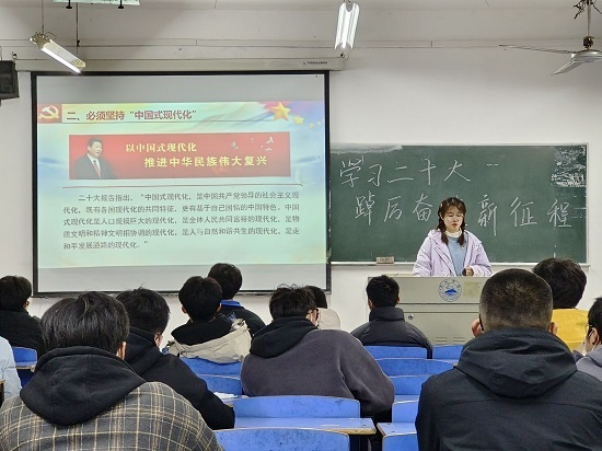 团委员工副书记张园园同学就学习贯彻党的二十大精神,围绕牢牢把握过去5年工作和新时代10年伟大变革的重大意义、牢牢把握习近平新时代中国特色社会主义思想的世界观和方法论、牢牢把握以中国式现代化推进中华民族伟大复兴的使命任务、牢牢把握以伟大自我革命引领伟大社会革命的重要要求、牢牢把握团结奋斗的时代要求等方面进行宣讲。