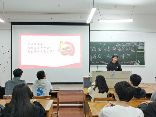 活动中,各班团支书先向同学们介绍“两会”是对自1959年以来历年召开的中华人民共和国全国人民代表大会和中国人民政治协商会议的统称等“两会”知识。随后带领同学们学习了习近平主席在十四届全国人大一次会议闭幕会上发表的重要讲话和政府工作报告中关于教育的工作部署。