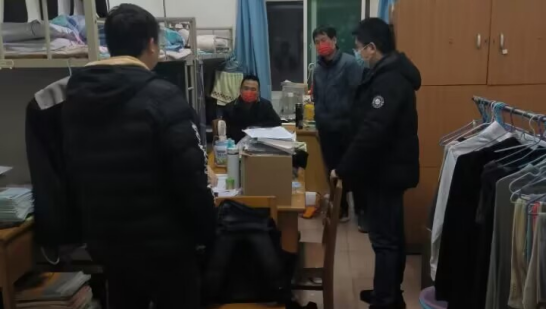 12月8日晚,公司汪傧书记、员工科朱亚军科长及值班教师一行赴15栋员工宿舍实地查看疫情防控及考研、期末考试备考等情况。