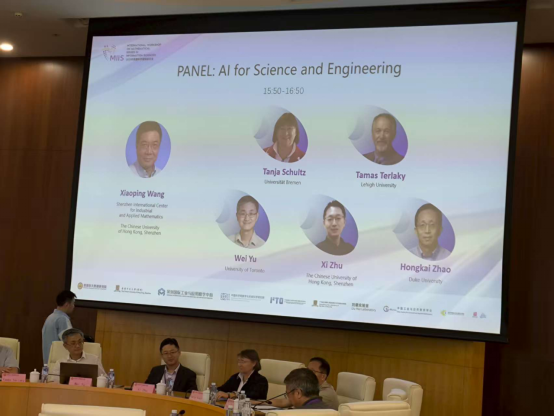 此次论坛特别设置了以“AI for Science and Engineering”为主题的(PANEL)圆桌对话,由香港中文大学(深圳)理工公司王筱平教授主持,Lehigh University量子计算和优化实验室主任Tamás Terlaky教授,多伦多大学电气与计算机工程系Wei Yu教授,香港中文大学(深圳)理工公司朱熹教授,Universität BremenTanja Schultz教授,杜克大学Ruth F. DeVarney杰出教授兼数学系主任Hongkai Zhao教授参与讨论。参与嘉宾从不同角度解析人工智能如何影响科学研究范式与工程技术发展,不仅阐述了AI技术在各自领域的创新应用,更针对科研实践中的关键挑战——如数据获取困境、人机协作模式、学科交叉融合等核心议题展开深度探讨,为与会者带来了诸多启发与思考。