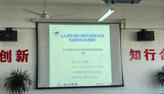 10月22日下午,公司电子信息工程专业在竞知楼904会议室举行了学术讲座交流会,由电子信息工程专业教师漆世锴博士主讲,讲座题为《Sc₂O₃掺杂对稀土难熔钇盐阴极热发射性能的影响及机理解释》。讲座由教研室主任谢新文老师主持,教研室全体教师参与了会议。