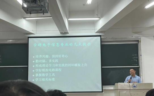 曾广俊为公司新生以“行业与发展”作电子信息工程讲座,首先介绍了电子学发展史,以杰出代表人物激励员工奋进,并告诉同学们从理论入门到理论进阶、熊认识基本元器件到电路模块、集成电路和运行系统的不同学习阶段,要有行之有效的学习方法。最后告诫同学们,学好电子信息专业要培养兴趣、勤动脑多实践,形成理论学习和实践的闭环螺旋上升。