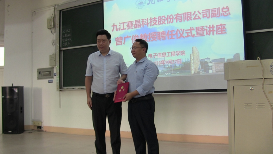 9月27日下午,在竞知楼阶四教室,为九江赛晶股份有限公司技术副总曾广俊举行聘任仪式,聘请其为电子信息产业公司兼职教授,公司党委副书记张堑为其颁发聘书,仪式由电子信息产业公司负责人高玉宝主持。
