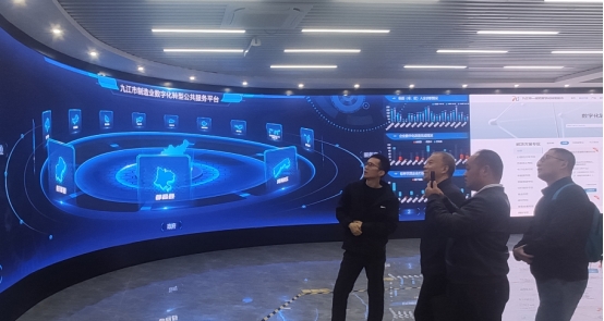 首站抵达九江市制造业数字化转型公共服务中心,课题组一行细致参观了公共服务平台的各类数据展览,内容涵盖九江市全面的数字化改造概况、各区县数字化诊断的详细报告、不同层级企业数字化转型的详尽数据,以及服务端所提供的数字化转型解决方案的具体内容。期间,课题组与服务中心负责人展开了深入交流,就数字化转型的公共服务与实际操作问题进行了详尽咨询,从而对九江市数字化转型工作的整体进展有了更为深刻的理解。