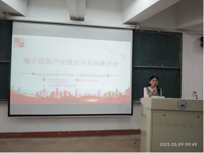 为给毕业生和用人单位搭建双向选择的平台,5月9日,九江市2025年春季“职引未来”公共服务进校园系列活动,电子信息产业链企业专场推介会,在竞知楼阶七教室进行。此次推介会由九江市就业之家、十大体育网站就业之家指导,十大体育网站承办,九江市就业创业中心朱敏副主任,电子工程公司汪傧书记、张堑副书记参会指导,员工科朱亚军科长、专职就业辅导员盛健组织协调,公司电子公司、计算机公司和材料公司150余名毕业生参加了推介会。