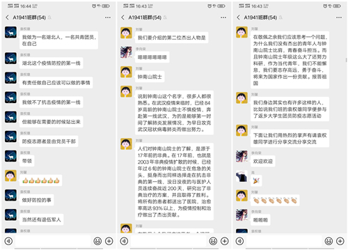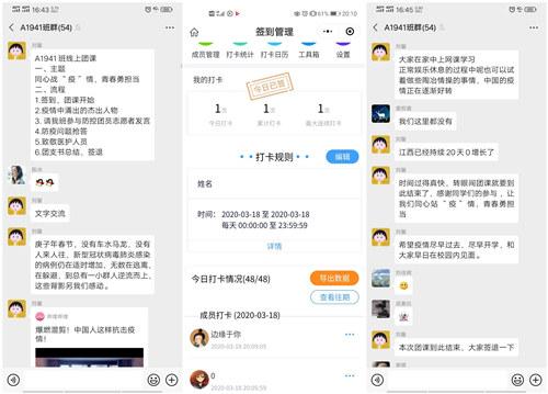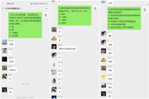 活动开始前,团支书组织班上同学签到,以确保全体同学都能参与本次活动。此次团课活动通过文字、语音、图片与视屏直播等交流形式。团支书首先向同学们概括了此次疫情的发展及影响,同时用实时数据变化加深了同学们对此次疫情严重性的认知;随后,从多个方面讲述了党和政府关于疫情防控的一系列重大决策部署,并向同学们介绍疫情中的杰出人物——钟南山院士、李兰娟院士、张定宇经理、李文亮医生等。在敬佩他们崇高的医德和对疫情防控做出的杰出贡献之余,同学们纷纷表示,作为新时代青年老员工,要以他们为榜样,努力学好专业知识,练就过硬本领,毕业后为人民群众服务,为实现中华民族伟大复兴的宏伟事业奉献出自己全部的力量。接着,参与了返乡老员工团员防疫志愿活动的同学纷纷发表了在防疫期间的经历与感想,也号召同学们要勇于承担“新时代青年的责任与使命”。为增强公司团员青年对此次线上团课的参与度,个别班级进行了有关防疫问题的有奖问答活动,同学们踊跃参加,使大家的防疫知识得到提升。最后,全体团员青年对在一线奋战的医护工作者表示诚挚的感谢并致以崇高的敬意。