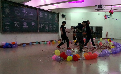 晚会由电子A1411班的杨龙和刘慧敏同学主持,晚会上,主持人首先向到场的女生送上了节日的祝福。随后表演开始,文艺部的街舞表演和歌曲《她不爱我》赢得了观众的阵阵掌声。在观众互动环节中,主持人请上10位同学进行了“双人夹爆气球”比赛和“朵朵桃花开”游戏。二胡独奏一曲悠扬动人,拨动人心弦。魔术表演引人入胜,绚丽夺目。无论今夜星光是否灿烂,那都是最美青春的风采。