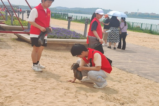 在活动中,志愿者们分工明确,干劲十足。他们有的负责捡起沙滩上的卫生纸,有的专注于清理枯枝落叶和烟头垃圾,还有的对路上塑料瓶进行清理。“志愿红”成为海韵沙滩公园里一道亮丽的风景线。