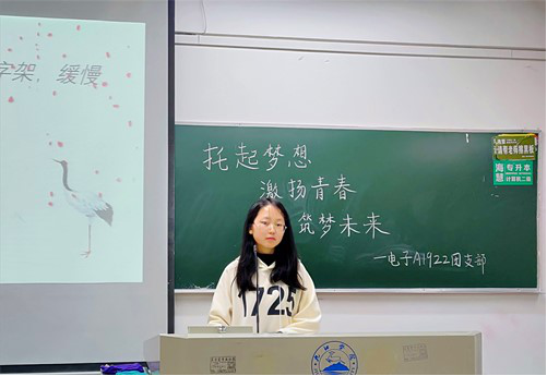 “青春似火,身为新一代老员工,更是壮志满腔。让我们带着对青春的热情,在同学们高昂的情绪氛围中,走进此次团日活动。”各班团支书用一段满怀激情的开场白,将同学们的注意力集中到今天的“青春梦想”主题上。活动中,同学们以轻松欢快的歌曲、豪情万丈的朗诵等方式分享了自己的梦想和对未来的展望。最后,同学们以集体朗诵的形式结束了此次团日活动,那满怀激情的声音,萦绕在心头,久久不散。