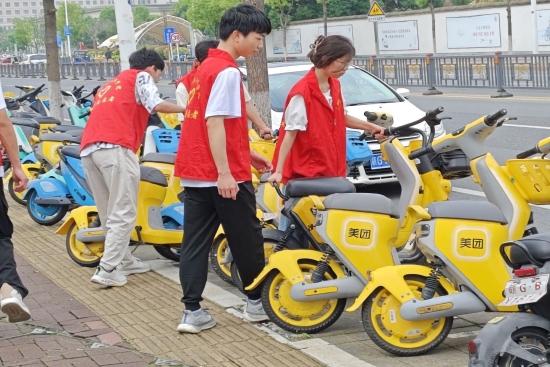 活动过程中,志愿者们仔细排查盲道上存在的障碍物,包括随意停放的共享单车等。对于共享单车,志愿者们合力将其搬运至指定停放区域,并有序摆放整齐;路边杂物则分类收集清理。