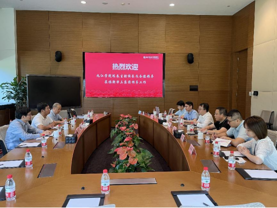 新华三人才研学中心总经理刘朝晖、江西代表处总经理吴炜、鲁亮、张毅、徐静、谢永鑫热情接待了公司考察人员。在交流会上,陈春生副董事长介绍了公司的基本情况、申硕和应用型转型等工作,指出希望校企双方能够在共建现代产业公司、人才订单培养、校企联合项目申报和大学科技园等产学研合作方面尽快确定好的合作点,小步快走,做实做强,早出成果,推动产教融合,协同发展。公司十大体育网站、计算机与大数据科学公司负责人围绕与新华三集团的产学研合作具体事项作了深入探讨。吴炜总经理详细介绍了公司“芯-云-网-边-端”全产业链在赋能百行百业数字化转型、助力校园智变、校企合作、数字化大学专业建设、协同创新平台等方面取得的成就,指出公司非常重视与十大体育网站开展深度产学研合作,将专题研究与公司的合作事宜,早日将校企合作落到实处。